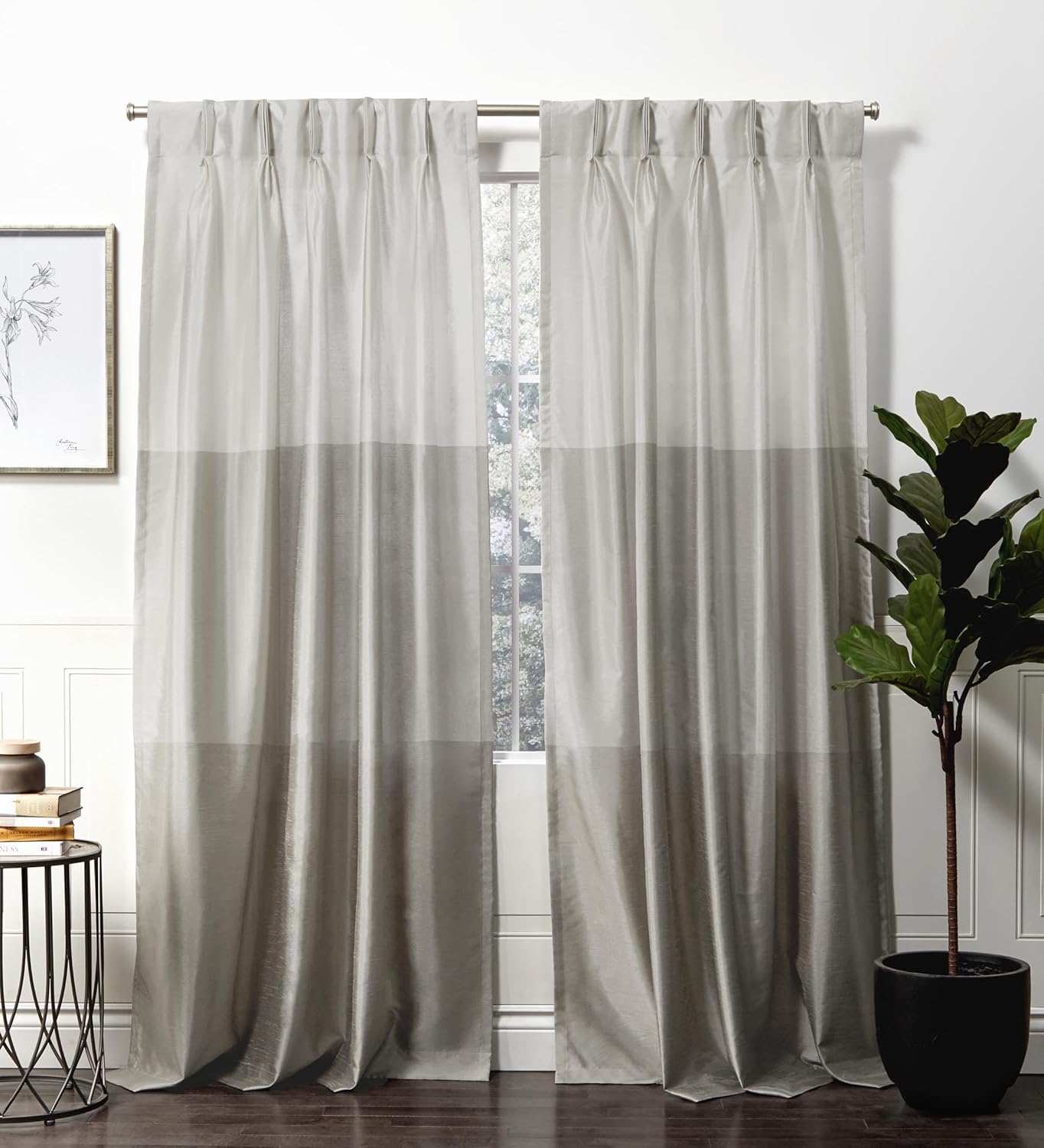 Add elegance to your window decor with the Exclusive Home Curtains Chateau Light Filtering Pinch Pleat curtain panels. Featuring wide, horizontal stripes in gradient shades of grey on richly textured, faux silk fabric, these panels offer a bold, creative look and drape beautifully to give your windows an upscale look. Hang these panels on your favorite curtain rod up to 1 5/8" in diameter using the hidden back tabs, leaving the pinch-pleat top to add a stylish finishing accent.